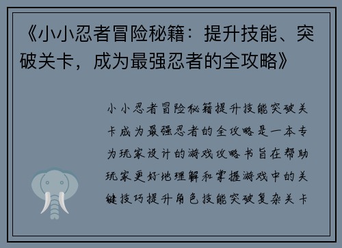 《小小忍者冒险秘籍:提升技能、突破关卡,成为最强忍者的全攻略》