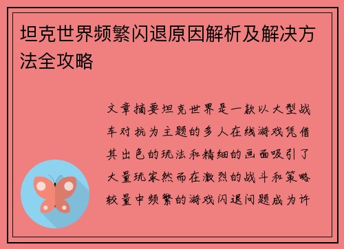 坦克世界频繁闪退原因解析及解决方法全攻略