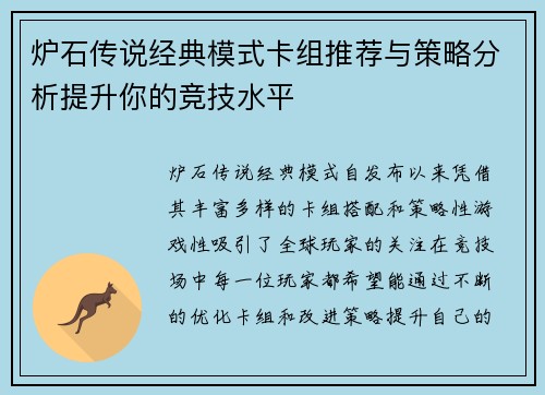 炉石传说经典模式卡组推荐与策略分析提升你的竞技水平