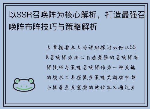 以SSR召唤阵为核心解析,打造最强召唤阵布阵技巧与策略解析